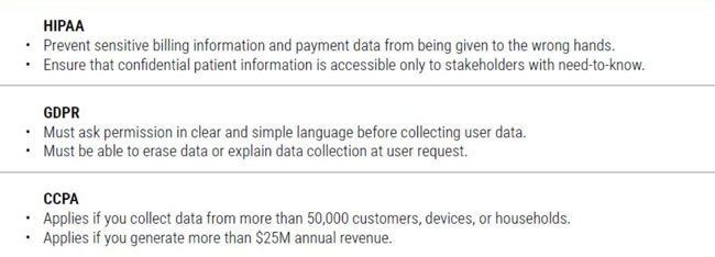 Major regulations (HIPAA, GLBA, CCPA, etc.)